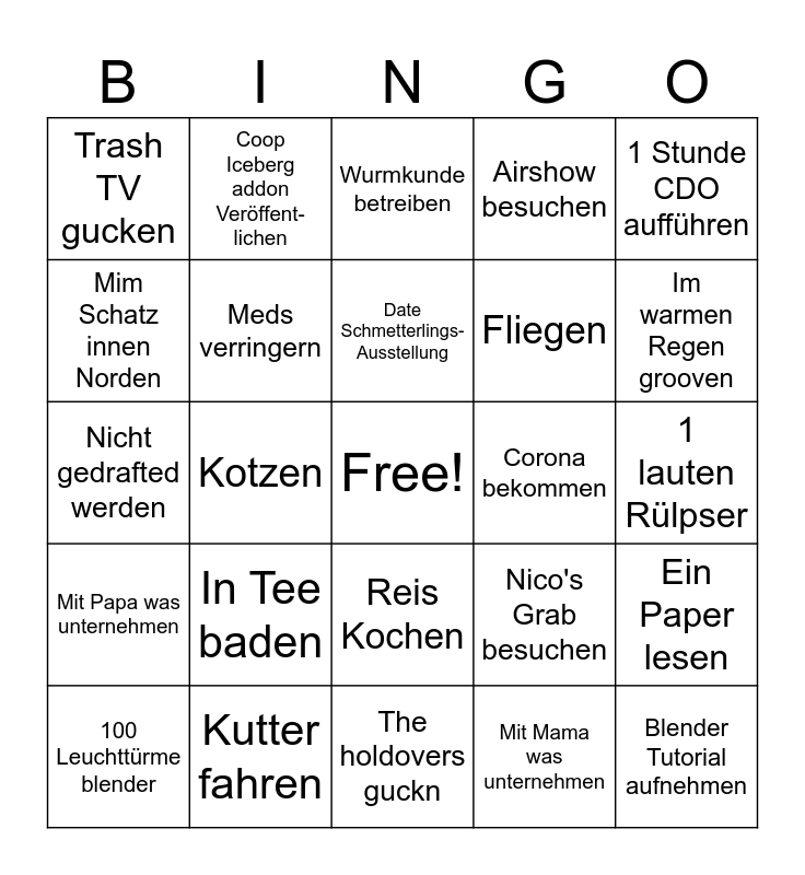 This bingo card has a free space and 24 words: In Tee baden, Kutter fahren, Date Schmetterlings- Ausstellung, 100 Leuchttürme blender, 1 Stunde CDO aufführen, Trash TV gucken, Mim Schatz innen Norden, Coop Iceberg addon Veröffent-lichen, Corona bekommen, Reis Kochen, Fliegen, Nicht gedrafted werden, Nico's Grab besuchen, Ein Paper lesen, Meds verringern, Mit Mama was unternehmen, 1 lauten Rülpser, Wurmkunde betreiben, Im warmen Regen grooven, Kotzen, Blender Tutorial aufnehmen, Mit Papa was unternehmen, Airshow besuchen and The holdovers guckn.
