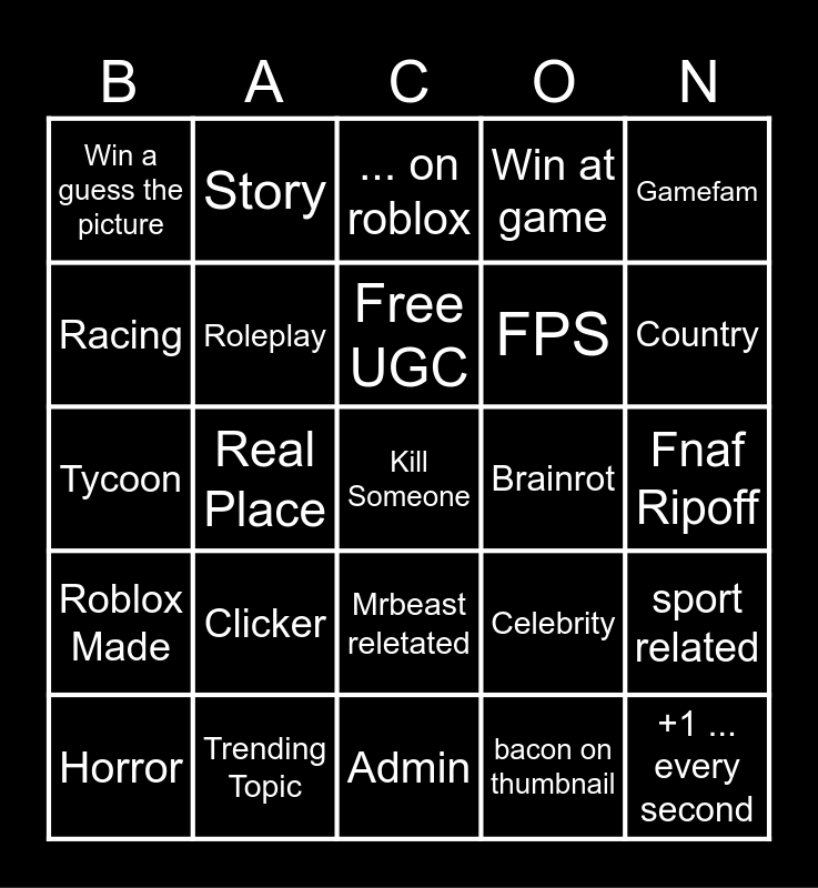 This bingo card has 40 words: Simulator, Tycoon, 500m Visits, Roleplay, Trending Topic, Mrbeast reletated, Free UGC, thing that cost robux which helps the player by being an active thing in the game other players can buy for ingame currencys but are much weaker then the robx item, Gamefam, Roblox Made, Real Place, Win at game, Kill Someone, Fnaf Ripoff, Brainrot, Clicker, $$$ on thumbnail, Win a guess the picture, Controverial, ... on roblox, sport related, bacon on thumbnail, FPS, Racing, Obby, Squid Game, This or that (movie, song, etc), Actually Game, +1 ... every second, be a ..., RNG, Horror, Line Game, Celebrity, Country, Admin, Donation, Thanos (Squid Game), Story and Survival.