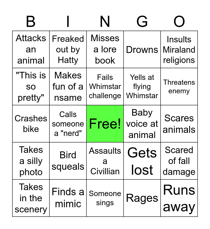 This bingo card has a free space and 35 words: Falls to his death, Is mean to Giovanni, Misses Dew of Inspiration, Makes fun of a nsame, Assaults a Civillian, Drowns, "This is so pretty", Feels "Bonita", Fails Whimstar challenge, Is mean to Momo, Crashes bike, Insults Miraland religions, Argues with Bird about style choice, Spends real money, Attacks an animal, Baby voice at animal, Rages, Calls someone a "nerd", Takes a silly photo, Runs away, Gets lost, Takes in the scenery, Scared of fall damage, Finds a mimic, Misses a lore book, Threatens enemy, Ground pounds enemy, Dies, Yells at flying Whimstar, Scares animals, Gets upset he scared the animal, Someone sings, Bird squeals, Freaked out by Hatty and Sigh of regret.