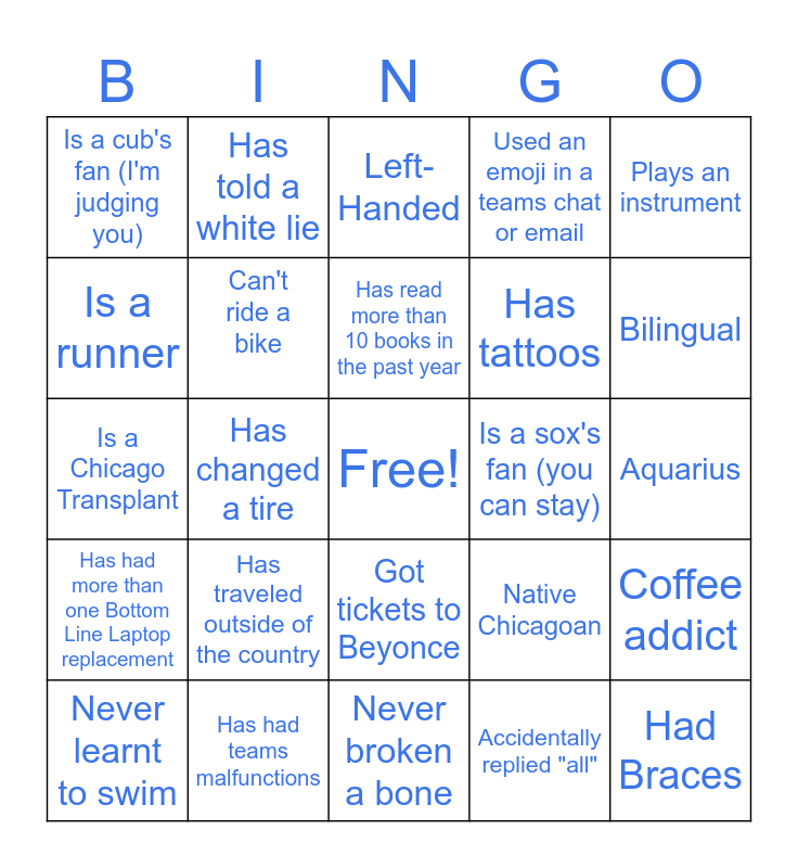 This bingo card has a free space and 25 words: Has traveled outside of the country, Never broken a bone, Has read more than 10 books in the past year, Never learnt to swim, Plays an instrument, Is a cub's fan (I'm judging you), Is a runner, Has told a white lie, Is a sox's fan (you can stay), Got tickets to Beyonce, Has tattoos, Is a Chicago Transplant, Native Chicagoan, Coffee addict, Can't ride a bike, is the oldest sibling, Aquarius, Left-Handed, Bilingual, Has changed a tire, Had Braces, Has had teams malfunctions, Has had more than one Bottom Line Laptop replacement, Used an emoji in a teams chat or email and Accidentally replied "all".