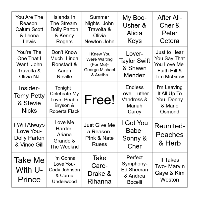 This bingo card has a free space and 50 words: I'm Real- J. Lo & Ja Rule, It Takes Two- Marvin Gaye & Kim Weston, Ain't No Mountain HIgh Enough- Marvie Gaye & Tammi Terrell, Take Care- Drake & Rihanna, Love Me Harder- Ariana Grande & The Weeknd, Jackson- Johnny & June Cash, Islands In The Stream- Dolly Parton & Kenny Rogers, Endless Love- Lionel Ritchie & Diana Ross, You're The One That I Want- John Travolta & Olivia NJ, (I've Had) The Time of My Life- Billy Medley & Jennifer Warnes, Don't Know Much- Linda Ronstadt & Aaron Neville, My Boo- Usher & Alicia Keys, Reunited- Peaches & Herb, I Got You Babe- Sonny & Cher, Don't Go Breaking My Heart- Elton John & Kiki Dee, Shallow- Lady Gaga & Bradley Cooper, I Knew You Were Waiting (For Me)- George Michael & Aretha, Endless Love- Luther Vandross & Mariah Carey, Unforgettable- Natalie Cole & Nat King Cole, After All- Cher & Peter Cetera, Tonight I Celebrate My Love- Peabo Bryson & Roberta Flack, Perfect Symphony- Ed Sheeran & Andrea Bocelli, You Are The Reason- Calum Scott & Leona Lewis, Lover- Taylor Swift & Shawn Mendez, Rewrite the Stars- Zac Efron & Zendaya, Nobody But You- Blake Shelton & Gwen Stefani, Just to Hear You Say That You Love Me- Faith Hill & Tim McGraw, Love Me Anyway- P!nk & Chris Stapleton, Summer Nights- John Travolta & Olivia Newton-John, Just Give Me a Reason- P!nk & Nate Ruess, Close My Eyes Forever- Lita Ford- Ozzy Osbourne, I Finally Found Someone- Barbra Streisand & Bryan Adams, Sea Of Heartbreak- Rosanne Cash & Bruce Springsteen, We've Got Tonight- Kenny Rogers & Sheena Easton, I'm Gonna Love You- Cody Johnson & Carrie Underwood, The Way You Look Tonight- Tony Bennet & Faith Hill, I Hate You Then I Love You- Dolly Parton & Vince Gill, Cheek to Cheek- Ella Fitzgerald & Louis Armstrong, Come Rain Or Come Shine- Barbra Streisand and John Mayer, I'm Leaving It All Up To You- Donny & Marie Osmond, You Don't Bring Me Flowers- Neil Diamond & Barbra Streisand, 03' Bonnie & Clyde- Beyonce & Jay-Z, Almost Paradise- Mike Reno & Ann Wilson, Surrender To Me- Ann Wilson & Robin Zandar, Take Me With U- Prince, Insider- Tomy Petty & Stevie Nicks, Leather and Lace- Stevie Nicks & Don Henley, Feels Like Home- Diana Krall & Bryan Adams, I Will Always Love You- Dolly Parton & Vince Gill and Can You Feel the Love Tonight- Boyce Avenue & Connie Talbot.