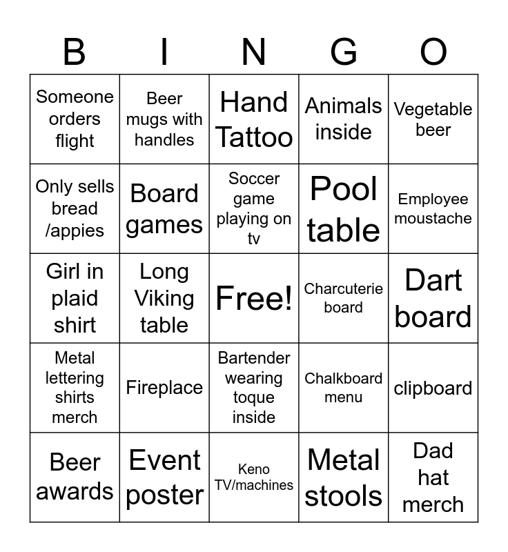 This bingo card has a free space and 35 words: Wooden tap handles, Sitting beside tanks, Gaming devices, Board games, Bartender wearing toque inside, Animals inside, Only sells bread /appies, Live music, Soccer game playing on tv, Solo drinker at bar (knows everyone), Girl in plaid shirt, Vegetable beer, Stout over 9%, Ipa over 9%, Someone orders flight, Charcuterie board, Metal stools, Long Viking table, Metal lettering shirts merch, Dad hat merch, Chalkboard menu, Beer awards, clipboard, Event poster, Hand Tattoo, Employee moustache, The tiniest washroom you’ve ever been in, Gender neutral washroom, Pool table, Dart board, Paisley Carpet, Keno TV/machines, Fireplace, Beer mugs with handles and Guinness sign.