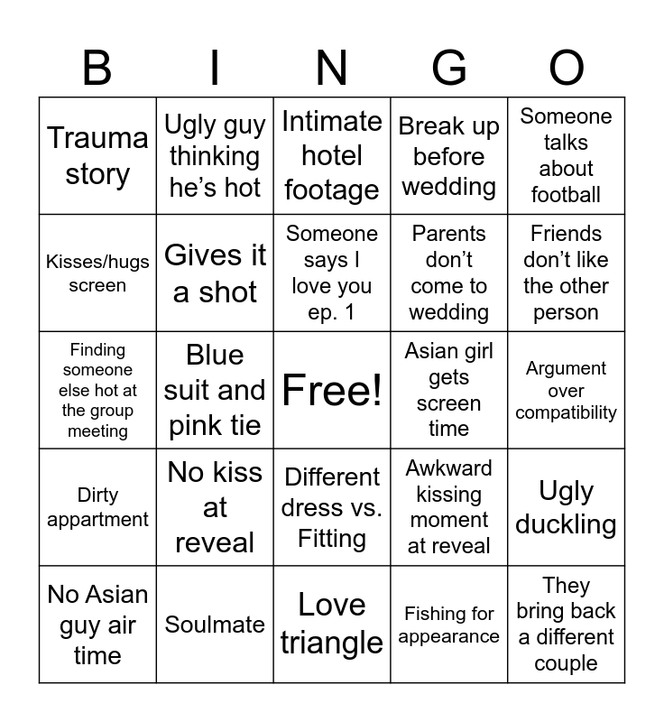 This bingo card has a free space and 24 words: No Asian guy air time, No kiss at reveal, Someone says I love you ep. 1, Fishing for appearance, Someone talks about football, Trauma story, Ugly guy thinking he’s hot, Intimate hotel footage, Asian girl gets screen time, Argument over compatibility, Finding someone else hot at the group meeting, Gives it a shot, Awkward kissing moment at reveal, Ugly duckling, Kisses/hugs screen, Soulmate, Love triangle, Break up before wedding, Friends don’t like the other person, Dirty appartment, Blue suit and pink tie, Different dress vs. Fitting, Parents don’t come to wedding and They bring back a different couple.