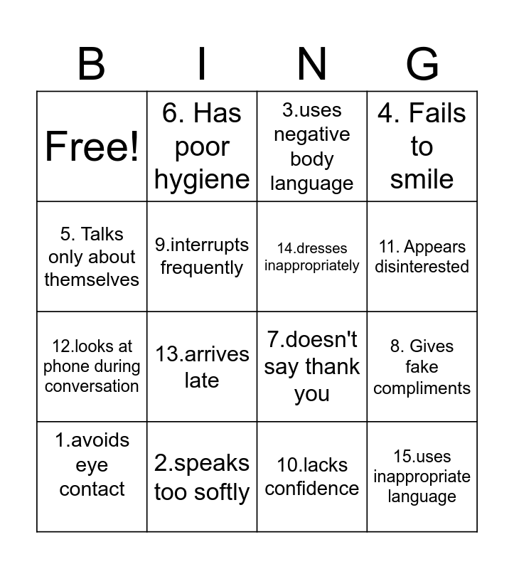 This bingo card has 16 words: 1.avoids eye contact, 2.speaks too softly, 3.uses negative body language, 4. Fails to smile, 5. Talks only about themselves, 6. Has poor hygiene, 7.doesn't say thank you, 8. Gives fake compliments, Free!, 9.interrupts frequently, 10.lacks confidence, 11. Appears disinterested, 12.looks at phone during conversation, 13.arrives late, 14.dresses inappropriately and 15.uses inappropriate language.