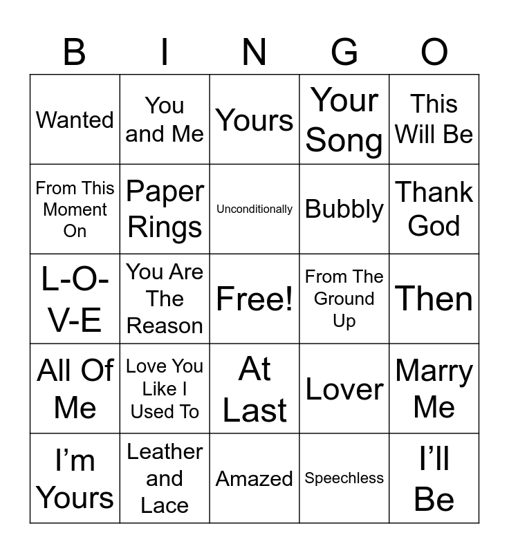 This bingo card has a free space and 31 words: Amazed, When You Say Nothing At All, You Are The Reason, Can’t Help Falling In Love, Wanted, Yours, Paper Rings, Lover, From The Ground Up, Speechless, Then, I’ll Be, Perfect, Thinking Out Loud, Thank God, My Best Friend, Marry Me, Love You Like I Used To, All Of Me, At Last, This Will Be, Islands In the Stream, I’m Yours, You and Me, Bubbly, From This Moment On, Your Song, L-O-V-E, Leather and Lace, Unconditionally and Have I Told You Lately.