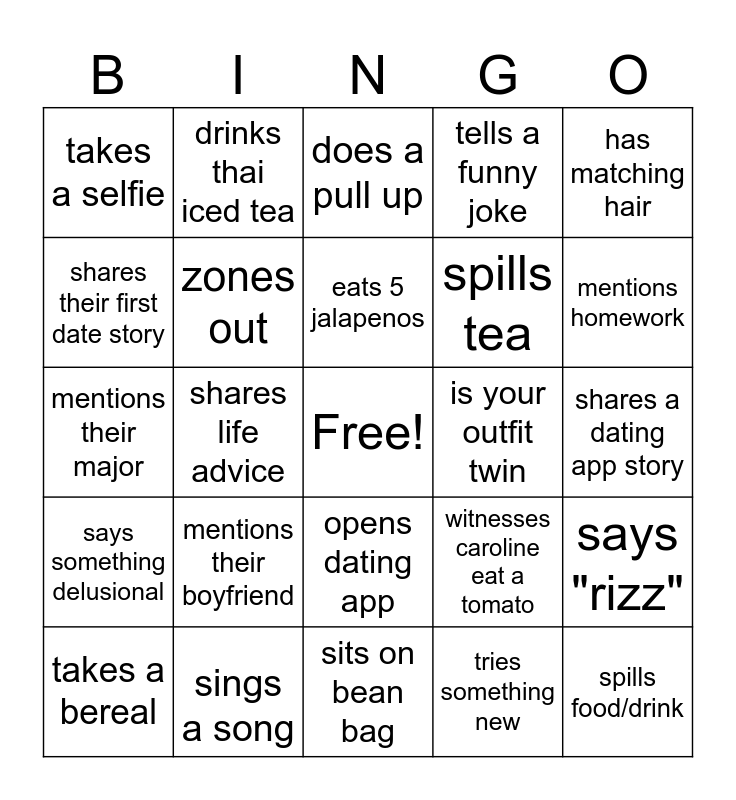 This bingo card has a free space and 24 words: mentions their boyfriend, sings a song, eats 5 jalapenos, takes a bereal, has matching hair, takes a selfie, shares their first date story, drinks thai iced tea, is your outfit twin, opens dating app, spills tea, mentions their major, witnesses caroline eat a tomato, says "rizz", zones out, tries something new, shares a dating app story, does a pull up, mentions homework, shares life advice, spills food/drink, says something delusional, tells a funny joke and sits on bean bag.