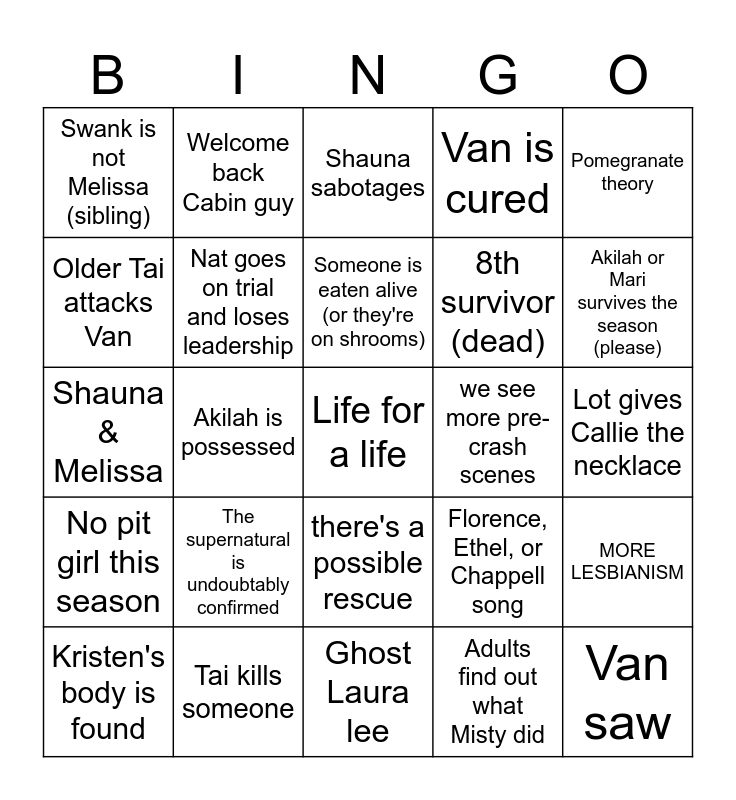 This bingo card has a free space and 24 words: The supernatural is undoubtably confirmed, Tai kills someone, Someone is eaten alive (or they're on shrooms), Kristen's body is found, Pomegranate theory, Swank is not Melissa (sibling), Older Tai attacks Van, Welcome back Cabin guy, we see more pre-crash scenes, there's a possible rescue, 8th survivor (dead), Shauna & Melissa, Florence, Ethel, or Chappell song, MORE LESBIANISM, Nat goes on trial and loses leadership, Adults find out what Misty did, Lot gives Callie the necklace, Shauna sabotages, Akilah or Mari survives the season (please), Akilah is possessed, Van saw, No pit girl this season, Van is cured and Ghost Laura lee.