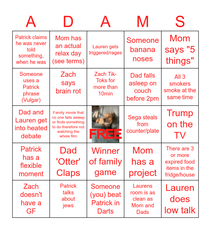 This bingo card has a free space and 24 words: Dad 'Otter' Claps, Patrick talks about jews, Zach Tik-Toks for more than 10min, Zach doesn't have a GF, Mom says "5 things", Patrick claims he was never told something, when he was, Someone uses a Patrick phrase (Vulgar), Mom has an actual relax day (see terms), Sega steals from counter/plate, Winner of family game, Dad falls asleep on couch before 2pm, Dad and Lauren get into heated debate, Mom has a project, There are 3 or more expired food items in the fridge/house, Zach says brain rot, Laurens room is as clean as Mom and Dads, Trump on the TV, Lauren gets triggered/rages, All 3 smokers smoke at the same time, Family movie that no one falls asleep or finds something to do therefore not watching the whole film, Lauren does low talk, Patrick has a flexible moment, Someone banana noses and Someone (you) beat Patrick in Darts.