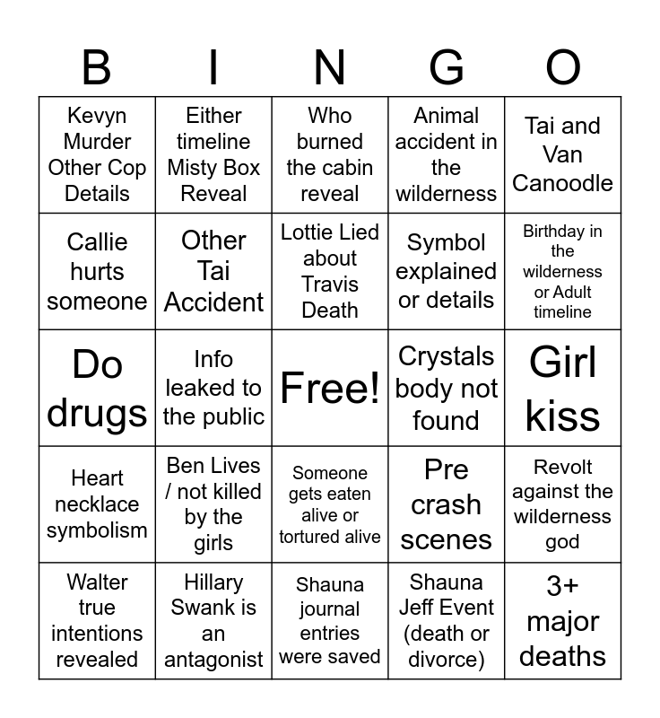 This bingo card has a free space and 24 words: Ben Lives / not killed by the girls, Hillary Swank is an antagonist, Lottie Lied about Travis Death, Walter true intentions revealed, Tai and Van Canoodle, Kevyn Murder Other Cop Details, Callie hurts someone, Either timeline Misty Box Reveal, Crystals body not found, Someone gets eaten alive or tortured alive, Symbol explained or details, Do drugs, Pre crash scenes, Revolt against the wilderness god, Other Tai Accident, Shauna Jeff Event (death or divorce), Girl kiss, Who burned the cabin reveal, Birthday in the wilderness or Adult timeline, Info leaked to the public, 3+ major deaths, Heart necklace symbolism, Animal accident in the wilderness and Shauna journal entries were saved.