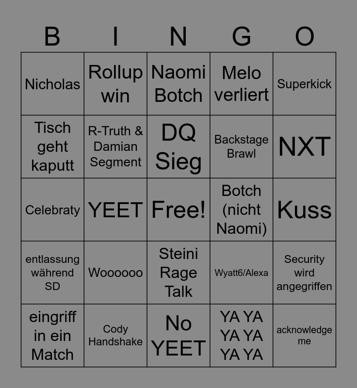 This bingo card has a free space and 24 words: Woooooo, Cody Handshake, DQ Sieg, eingriff in ein Match, Superkick, Nicholas, Tisch geht kaputt, Rollup win, Botch (nicht Naomi), Steini Rage Talk, Backstage Brawl, Celebraty, Wyatt6/Alexa, Security wird angegriffen, R-Truth & Damian Segment, YA YA YA YA YA YA, Kuss, Naomi Botch, NXT, YEET, acknowledge me, entlassung während SD, Melo verliert and No YEET.