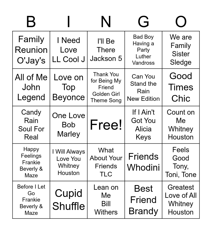This bingo card has a free space and 26 words: What About Your Friends TLC, Best Friend Brandy, Thank You for Being My Friend Golden Girl Theme Song, Cupid Shuffle, We are Family Sister Sledge, Family Reunion O'Jay's, All of Me John Legend, I Need Love LL Cool J, Count on Me Whitney Houston, Friends Whodini, Can You Stand the Rain New Edition, Candy Rain Soul For Real, Feels Good Tony, Toni, Tone, Before I Let Go Frankie Beverly & Maze, One Love Bob Marley, Electric Slide, Bad Boy Having a Party Luther Vandross, Happy Feelings Frankie Beverly & Maze, I'll Be There Jackson 5, Greatest Love of All Whitney Houston, Good Times Chic, Lean on Me Bill Withers, If I Ain't Got You Alicia Keys, I Will Always Love You Whitney Houston, Love on Top Beyonce and Angel of Mine Monica.