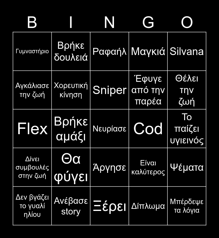 This bingo card has 50 words: Παρεξηγήθηκε, Νευρίασε, Death stare, Ξέρει, Θα φύγει, Θα φύγει από το discount, Βρήκε δουλειά, Παθητικό εισόδημα, Αγκάλιασε την ζωή, Κάνει πως ξέρει, Χορευτική κίνηση, Μαγκιά, Ψέματα, Είναι καλύτερος, Hero quest, Bang, Sniper, Cod, Mobile legends, Silvana, Βρήκε αμάξι, Δίπλωμα, Γυμναστήριο, Έφυγε από την παρέα, Απείλησε, Μπέρδεψε τα λόγια, Θέλει την ζωή, Αυτά με το αγόρι σου, Ραφαήλ, Άργησε, Προσπάθησε να είναι αστείος, Έγινε σιμητος, Είπε μαλακια, Έγραψε note, Ανέβασε story, Έκανε τον φωτογράφο, Βρήκε γνωστό, Κάθεται στο κινητό, Κάνει πως ξέρει από ποτά, Το παίζει υγιεινός, Κουραστικε, Είναι πρωινός, Είναι βραδυνος, Δουλεύει περισσότερο από όλους, Δεν βγάζει το γυαλί ηλίου, Flex, Μιλάει με γνωστό πάνω από 2 λεπτά, Δίνει συμβουλές, Δίνει συμβουλές στην ζωή and Έγινε Τρύφωνας.