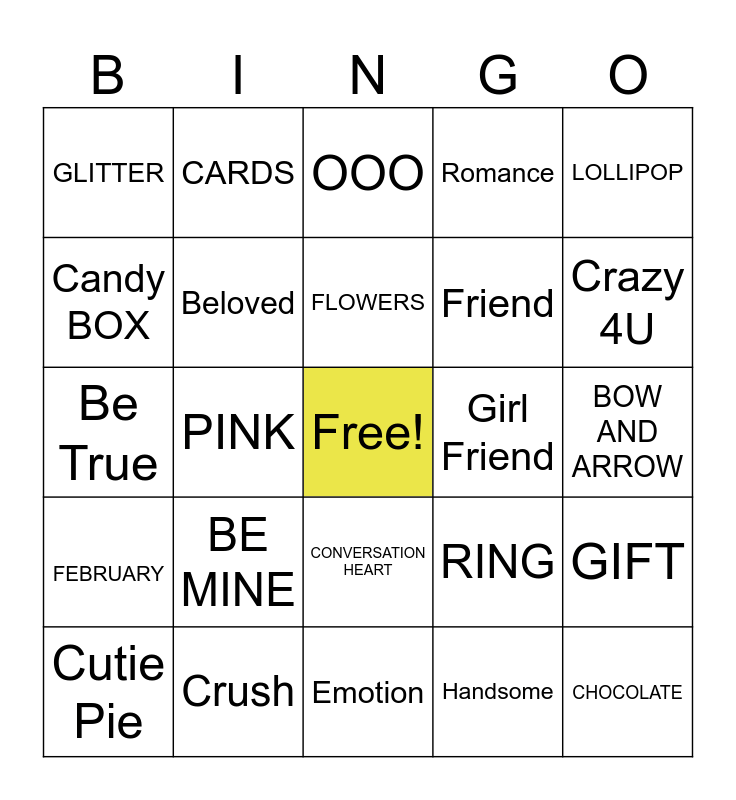 This bingo card has a free space and 68 words: HEART, CHOCOLATE, lace, BALLOONS, Love, Happy Valentines Day, CARDS, Candles, FLOWERS, the 14th, CONVERSATION HEART, CUPID, BOW AND ARROW, LOLLIPOP, Red, Candy BOX, PINK, GLITTER, TEDDY BEAR, BE MINE, Friend, RING, FEBRUARY, ROSES, A POEM, XXX, KISSES, HUGS, GIFT, PRESENT, OOO, CUPID, SWEET, A song, Romance, Perfume, Stuffed Animal, Cutie Pie, Crazy 4U, Be True, 4 Ever, Call Me, Beloved, Heartthrob, Snuggle, Affection, Celebration, Boy Friend, Girl Friend, Crush, Dance, Dear, Devotion, Emotion, Flirt, Holding Hands, Handsome, Beautiful, Holiday, Jewelry, Romeo, Juliet, Dove, Party, Puppy Love, Secret Admirer, Smooch and Blushing.