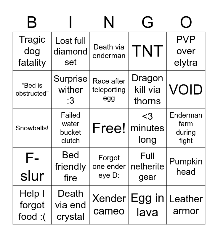 This bingo card has a free space and 24 words: Bed friendly fire, Death via end crystal, Race after teleporting egg, Help I forgot food :(, PVP over elytra, Tragic dog fatality, “Bed is obstructed”, Lost full diamond set, <3 minutes long, Forgot one ender eye D:, Dragon kill via thorns, Snowballs!, Full netherite gear, Pumpkin head, Surprise wither :3, Egg in lava, Enderman farm during fight, Death via enderman, VOID, Failed water bucket clutch, Leather armor, F-slur, TNT and Xender cameo.