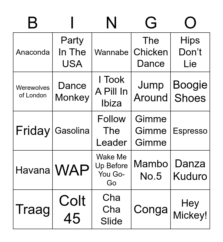 This bingo card has 55 words: Messy, Traag, Suavemente, Anaconda, Cha Cha Slide, Blurred Lines, Dance Monkey, Calabria 2008, Jump Around, My Neck, My Back, The Chicken Dance, Hey Ya!, YMCA, I’m Too Sexy, Ice Ice Baby, Tarzan & Jane, Hips Don’t Lie, Gasolina, Dance The Night, Follow The Leader, Gimme Gimme Gimme, Cotton Eye Joe, Mambo No.5, Wannabe, September, I Took A Pill In Ibiza, Conga, Thriller, Espresso, Danza Kuduro, You’re The One That I Want, Uptown Funk, The Ketchup Song, I’m Gonna Be (500 Miles), Werewolves of London, Friday, Hot To Go!, Havana, Hey Mickey!, Lollipop, Party In The USA, Shake It Off, Pepas, Macarena, WAP, Colt 45, Levitating, Zorba, Hot Hot Hot, Boogie Shoes, Tubthumping, Robot Dance, The Hustle, Wake Me Up Before You Go-Go and Barbie Girl.