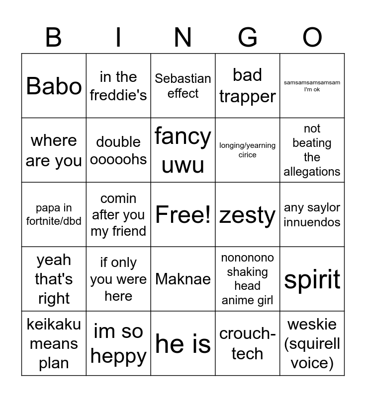 This bingo card has a free space and 24 words: if only you were here, im so heppy, fancy uwu, keikaku means plan, samsamsamsamsam I'm ok, Babo, where are you, in the freddie's, zesty, Maknae, longing/yearning cirice, papa in fortnite/dbd, nononono shaking head anime girl, spirit, double ooooohs, crouch-tech, any saylor innuendos, Sebastian effect, not beating the allegations, comin after you my friend, weskie (squirell voice), yeah that's right, bad trapper and he is.