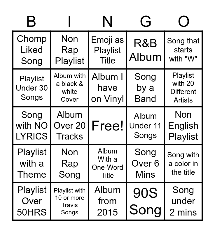 This bingo card has a free space and 24 words: Non Rap Song, Playlist with 10 or more Travis Songs, Album I have on Vinyl, Playlist Over 50HRS, Song that starts with "W", Chomp Liked Song, Playlist Under 30 Songs, Non Rap Playlist, Album Under 11 Songs, Album With a One-Word Title, Song by a Band, Song with NO LYRICS, Song Over 6 Mins, Song with a color in the title, Album with a black & white Cover, 90S Song, Non English Playlist, Emoji as Playlist Title, Playlist with 20 Different Artists, Album Over 20 Tracks, Song under 2 mins, Playlist with a Theme, R&B Album and Album from 2015.