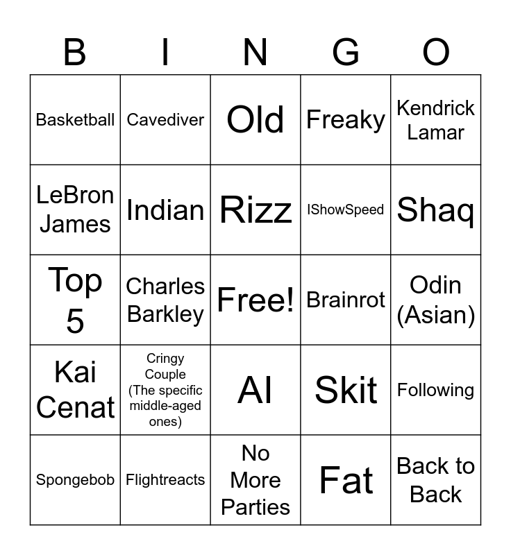 This bingo card has a free space and 24 words: Cringy Couple (The specific middle-aged ones), Flightreacts, Rizz, Spongebob, Kendrick Lamar, Basketball, LeBron James, Cavediver, Brainrot, AI, IShowSpeed, Top 5, Skit, Following, Indian, Fat, Odin (Asian), Old, Shaq, Charles Barkley, Back to Back, Kai Cenat, Freaky and No More Parties.
