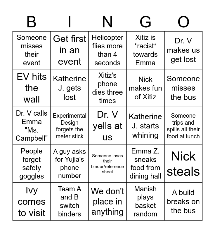 This bingo card has a free space and 24 words: A guy asks for Yujia's phone number, Team A and B switch binders, Xitiz's phone dies three times, Ivy comes to visit, Dr. V makes us get lost, Someone misses their event, EV hits the wall, Get first in an event, Katherine J. starts whining, Someone loses their binder/reference sheet, Nick makes fun of Xitiz, Dr. V calls Emma "Ms. Campbell", Emma Z. sneaks food from dining hall, Nick steals, Katherine J. gets lost, Manish plays basket random, Someone trips and spills all their food at lunch, Helicopter flies more than 4 seconds, Someone misses the bus, Experimental Design forgets the meter stick, A build breaks on the bus, People forget safety goggles, Xitiz is *racist* towards Emma and We don't place in anything.