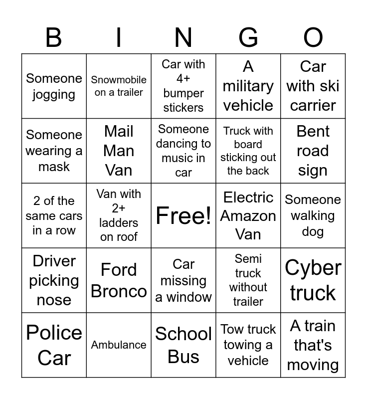 This bingo card has a free space and 28 words: Cyber truck, Car in the ditch, Truck with board sticking out the back, Tow truck towing a vehicle, Someone wearing a mask, Car with 4+ bumper stickers, Snowmobile on a trailer, Driver picking nose, Electric Amazon Van, Police Car, 2 of the same cars in a row, A military vehicle, Ambulance, School Bus, Bent road sign, Snow plow, Ford Bronco, Mail Man Van, Someone dancing to music in car, Car missing a window, Someone jogging, Jeep truck, A train that's moving, Van with 2+ ladders on roof, Someone walking dog, Semi truck without trailer, Car with ski carrier and Dog riding in car.