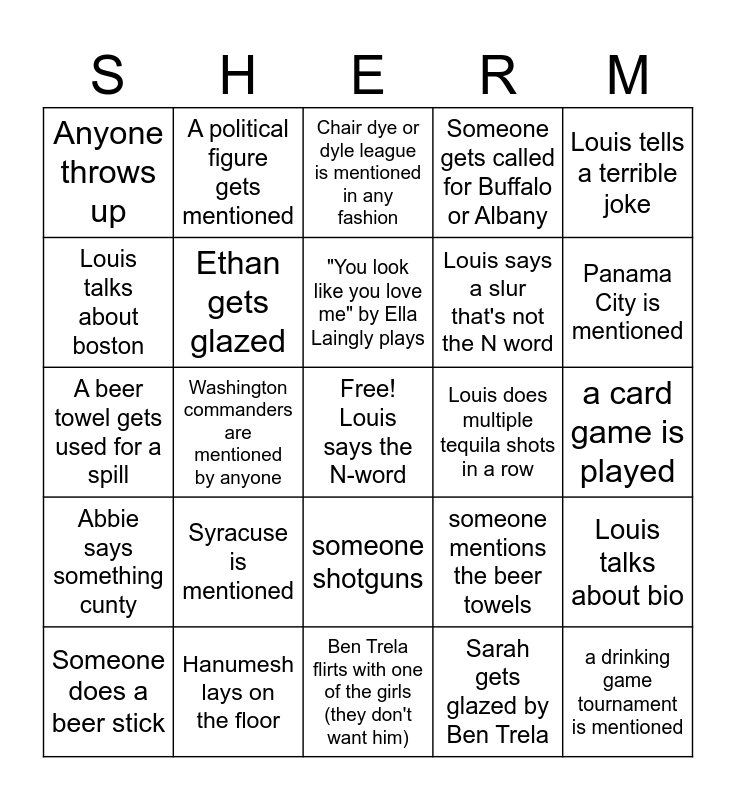 This bingo card has a free space and 29 words: Someone does a beer stick, Louis goes to bed before 12:00, Washington commanders are mentioned by anyone, Hanumesh Throws up, Anyone throws up, Chair dye or dyle league is mentioned in any fashion, Ethan gets glazed, Syracuse is mentioned, Louis does multiple tequila shots in a row, Hanumesh lays on the floor, a card game is played, a drinking game tournament is mentioned, Ben Trela flirts with one of the girls (they don't want him), Sarah gets glazed by Ben Trela, Panama City is mentioned, Someone does a freedom funnel, someone shotguns, Abbie says something cunty, Louis tells a terrible joke, A beer towel gets used for a spill, someone mentions the beer towels, someone gets called gay, Louis says a slur that's not the N word, Louis talks about boston, Someone gets called for Buffalo or Albany, A political figure gets mentioned, Louis talks about bio, "You look like you love me" by Ella Laingly plays and Something in the house breaks.