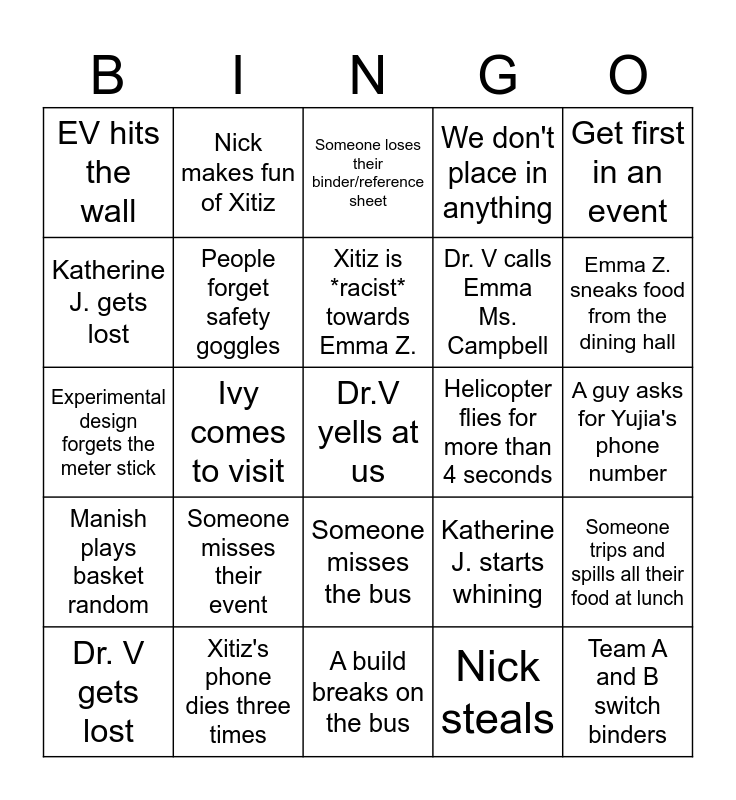 This bingo card has a free space and 24 words: Someone misses their event, Xitiz's phone dies three times, Xitiz is *racist* towards Emma Z., Dr. V gets lost, Get first in an event, EV hits the wall, Katherine J. gets lost, Nick makes fun of Xitiz, Helicopter flies for more than 4 seconds, Someone misses the bus, Dr. V calls Emma Ms. Campbell, Experimental design forgets the meter stick, Katherine J. starts whining, Someone trips and spills all their food at lunch, People forget safety goggles, Nick steals, A guy asks for Yujia's phone number, Someone loses their binder/reference sheet, Emma Z. sneaks food from the dining hall, Ivy comes to visit, Team A and B switch binders, Manish plays basket random, We don't place in anything and A build breaks on the bus.