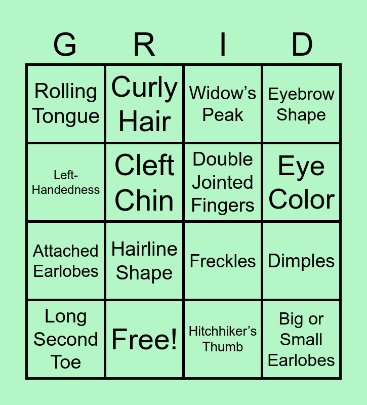 This bingo card has 16 words: Free!, Dimples, Widow’s Peak, Rolling Tongue, Attached Earlobes, Curly Hair, Freckles, Hitchhiker’s Thumb, Left-Handedness, Cleft Chin, Long Second Toe, Eyebrow Shape, Hairline Shape, Eye Color, Double Jointed Fingers and Big or Small Earlobes.