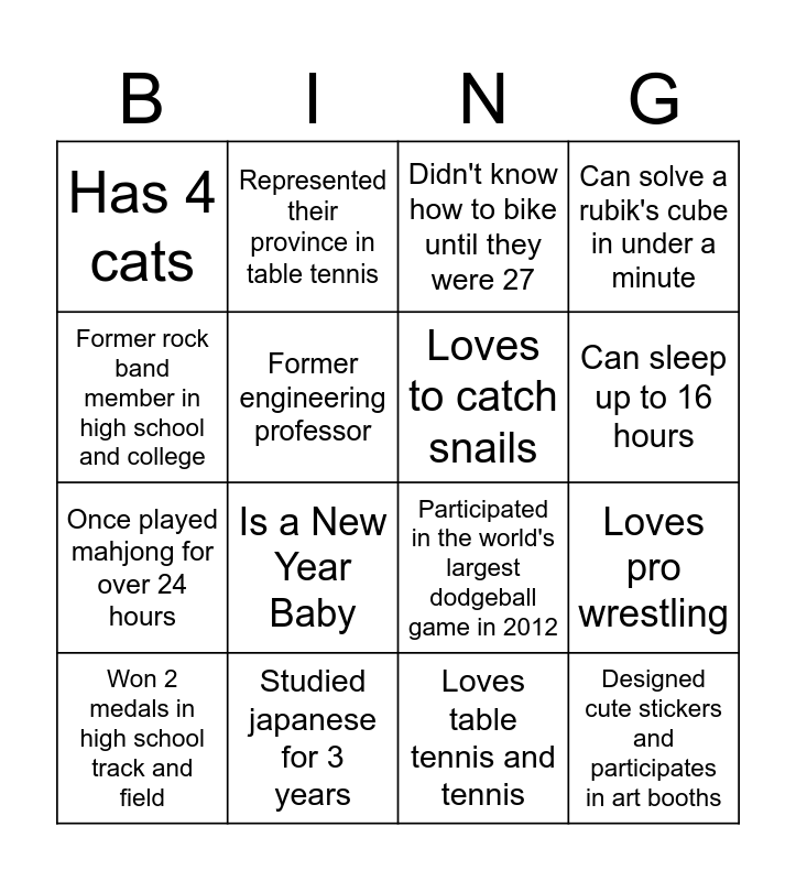 This bingo card has 27 words: Free!, Everybody in their family was born on the 17th. Them Spouse, Kids, and Pets, Once played mahjong for over 24 hours, Likes to kite-surf and scuba dive, Former engineering professor, Didn't know how to bike until they were 27, Represented their province in table tennis, Designed cute stickers and participates in art booths, Studied japanese for 3 years, Didn't know their real birthday until high school, Participated in the world's largest dodgeball game in 2012, Can solve a rubik's cube in under a minute, Is a licensed physical therapist, Is a member of Mensa - the world's oldest high IQ society, Is a New Year Baby, Is an amateur photographer, Loves to catch snails, Can sleep up to 16 hours, Former band vocalist, Has 4 cats, Loves table tennis and tennis, Loves coffees so much, they're a part time barista, Loves pro wrestling, Won 2 medals in high school track and field, Has a twin brother, Former rock band member in high school and college and Is going to hike to K2 base camp.