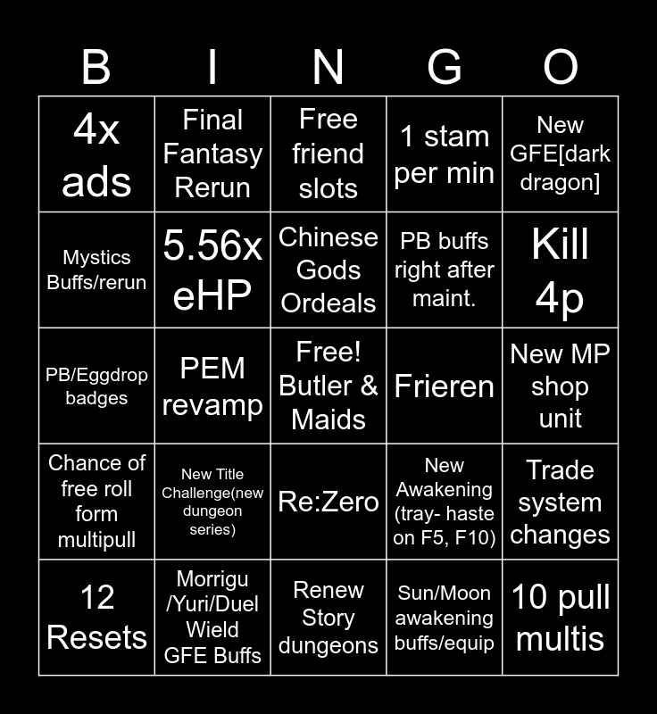 This bingo card has a free space and 24 words: New Title Challenge(new dungeon series), Morrigu /Yuri/Duel Wield GFE Buffs, Chinese Gods Ordeals, 12 Resets, New GFE[dark dragon], 4x ads, Mystics Buffs/rerun, Final Fantasy Rerun, Frieren, Re:Zero, PB buffs right after maint., PB/Eggdrop badges, New Awakening (tray- haste on F5, F10), Trade system changes, 5.56x eHP, Sun/Moon awakening buffs/equip, New MP shop unit, Free friend slots, Kill 4p, PEM revamp, 10 pull multis, Chance of free roll form multipull, 1 stam per min and Renew Story dungeons.
