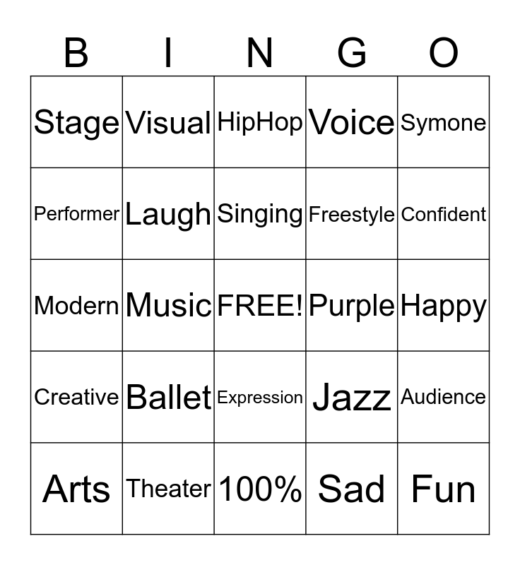 This bingo card has a free space and 24 words: Ballet, Theater, Singing, Arts, Symone, Stage, Performer, Visual, Purple, Expression, Freestyle, Modern, Jazz, Audience, Laugh, Sad, Happy, HipHop, Confident, Music, Fun, Creative, Voice and 100%.