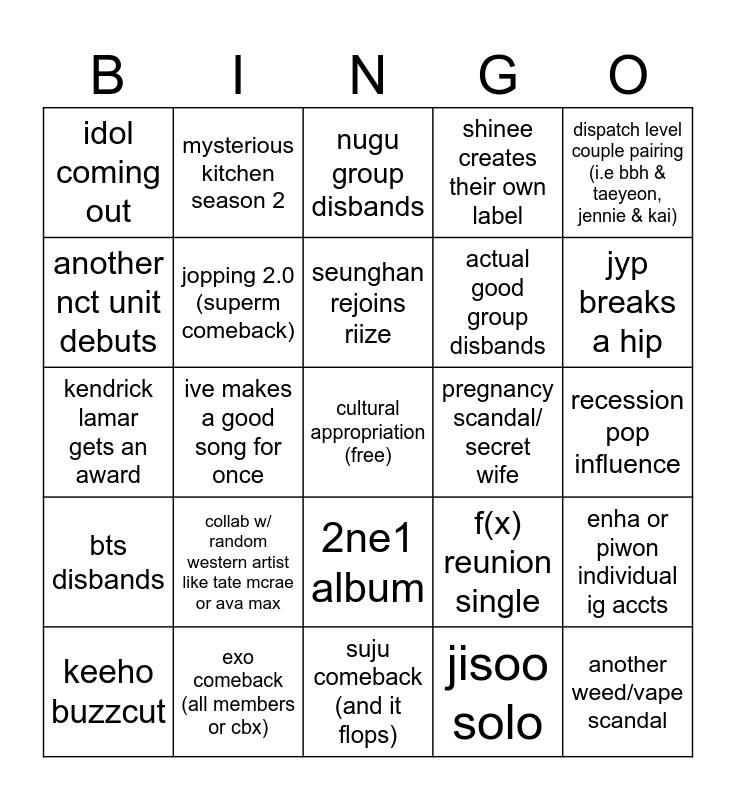 This bingo card has a free space and 24 words: collab w/ random western artist like tate mcrae or ava max, exo comeback (all members or cbx), seunghan rejoins riize, keeho buzzcut, dispatch level couple pairing (i.e bbh & taeyeon, jennie & kai), idol coming out, another nct unit debuts, mysterious kitchen season 2, pregnancy scandal/ secret wife, 2ne1 album, actual good group disbands, kendrick lamar gets an award, f(x) reunion single, enha or piwon individual ig accts, jopping 2.0 (superm comeback), jisoo solo, recession pop influence, nugu group disbands, jyp breaks a hip, ive makes a good song for once, another weed/vape scandal, bts disbands, shinee creates their own label and suju comeback (and it flops).
