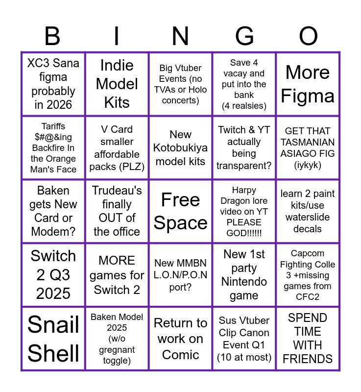 This bingo card has a free space and 34 words: Incidents at Black Company (again), Sus Vtuber Clip Canon Event Q1 (10 at most), Games. Sequel/New Port/New IP, Vtube Studio Updates, Switch 2 Q3 2025, V Card smaller affordable packs (PLZ), More Figma, Snail Shell, Indie Model Kits, NIKKE Figs & Model kits, New Kotobukiya model kits, Big Vtuber Events (no TVAs or Holo concerts), BFS Boss Fright Epic H.A.C.K.S. Blanks Q2 2025, New Trickywi model? 2025, Harpy Dragon lore video on YT PLEASE GOD!!!!!!, GET THAT TASMANIAN ASIAGO FIG (iykyk), Baken Model 2025 (w/o gregnant toggle), Baken gets New Card or Modem?, MORE games for Switch 2, New 1st party Nintendo game, New MMBN L.O.N/P.O.N port?, TGAs nominees 4 games in Beta (plz no), XC3 Sana figma probably in 2026, learn 2 paint kits/use waterslide decals, Return to work on Comic, SPEND TIME WITH FRIENDS, Save 4 vacay and put into the bank (4 realsies), Actually Eat Better, Twitch & YT actually being transparent?, Tariffs $#@&ing Backfire In the Orange Man's Face, Wildfires get contained, Trudeau's finally OUT of the office, Capcom Fighting Colle 3 +missing games from CFC2 and Hasbro gets Backlash for ML Maximum Series.