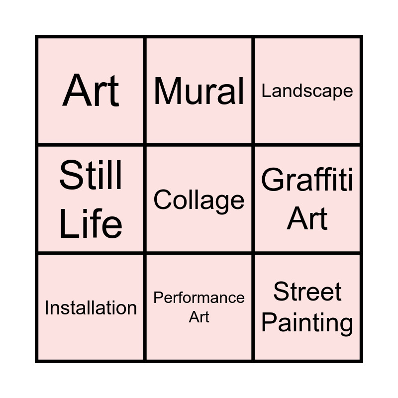 This bingo card has a free space and 11 words: Sketch, Performance Art, Street Painting, Installation, Mural, Landscape, Graffiti Art, Portrait, Still Life, Art and Artist.