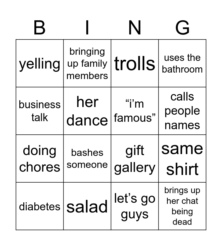 This bingo card has 16 words: salad, same shirt, trolls, yelling, doing chores, bringing up family members, gift gallery, let’s go guys, business talk, her dance, diabetes, uses the bathroom, bashes someone, calls people names, “i’m famous” and brings up her chat being dead.