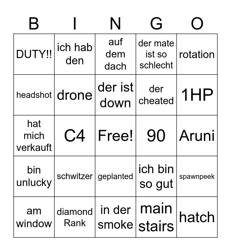 This bingo card has a free space and 24 words: schwitzer, diamond Rank, der ist down, am window, rotation, DUTY!!, headshot, ich hab den, 90, geplanted, der cheated, hat mich verkauft, ich bin so gut, spawnpeek, drone, main stairs, Aruni, auf dem dach, 1HP, C4, hatch, bin unlucky, der mate ist so schlecht and in der smoke.