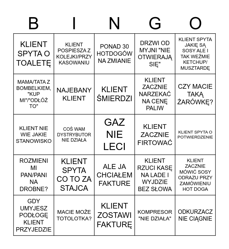 This bingo card has 25 words: KLIENT SPYTA CO TO ZA STAJCA, KLIENT ZOSTAWI FAKTURĘ, KLIENT ŚMIERDZI, GDY UMYJESZ PODŁOGĘ KLIENT PRZYJEDZIE, KLIENT SPYTA JAKIĘ SĄ SOSY ALE I TAK WEŹMIE KETCHUP/ MUSZTARDĘ, KLIENT SPYTA O TOALETĘ, MAMA/TATA Z BOMBELKIEM, "KUP MI"/"ODŁÓŻ TO", KLIENT POSPIESZA Z KOLEJKI/PRZY KASOWANIU, KLIENT ZACZNIE FIRTOWAĆ, ALE JA CHCIAŁEM FAKTURE, KLIENT ZACZNIE NARZEKAĆ NA CENĘ PALIW, KLIENT NIE WIE JAKIE STANOWISKO, KLIENT RZUCI KASĘ NA LADE I WYJDZIE BEZ SŁOWA, KLIENT ZACZNIE MÓWIĆ SOSY ODRAZU PRZY ZAMÓWIENIU HOT DOGA, NAJEBANY KLIENT, ODKURZACZ NIE CIĄGNIE, KLIENT SPYTA O POTWIERDZENIE, PONAD 30 HOTDOGÓW NA ZMIANIE, CZY MACIE TAKĄ ŻARÓWKĘ?, COŚ WAM DYSTRYBUTOR NIE DZIAŁA, GAZ NIE LECI, MACIE MOŻE TOTOLOTKA?, ROZMIENI MI PAN/PANI NA DROBNE?, DRZWI OD MYJNI "NIE OTWIERAJĄ SIĘ" and KOMPRESOR "NIE DZIAŁA".