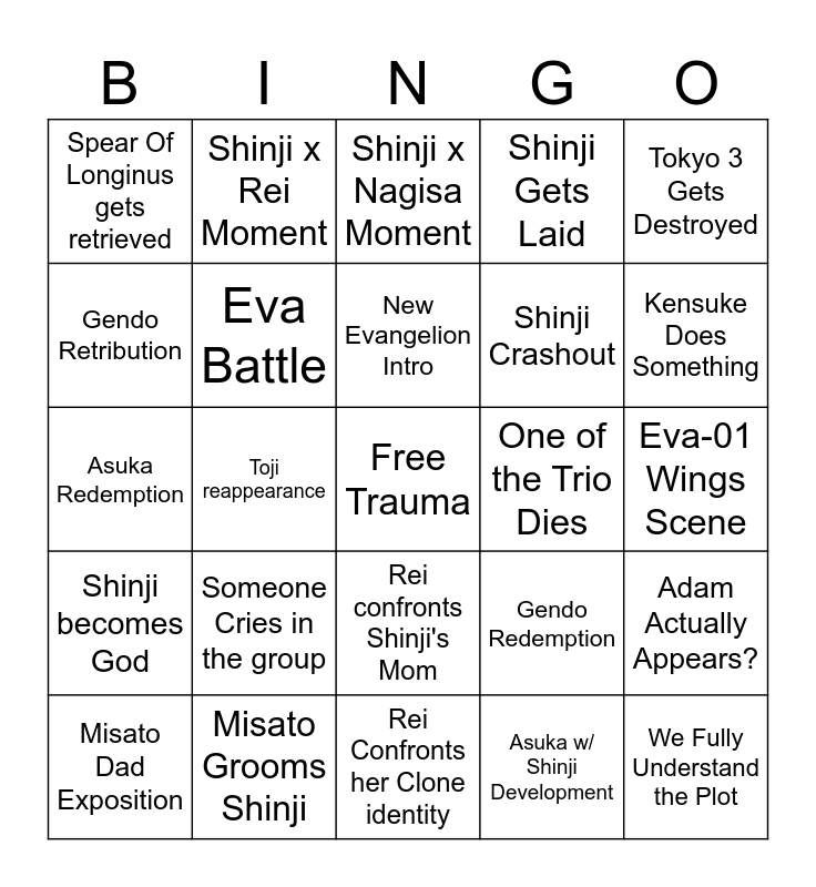 This bingo card has a free space and 24 words: Someone Cries in the group, Misato Grooms Shinji, New Evangelion Intro, Misato Dad Exposition, Tokyo 3 Gets Destroyed, Spear Of Longinus gets retrieved, Gendo Retribution, Shinji x Rei Moment, One of the Trio Dies, Rei confronts Shinji's Mom, Shinji Crashout, Asuka Redemption, Gendo Redemption, Adam Actually Appears?, Eva Battle, Asuka w/ Shinji Development, Eva-01 Wings Scene, Shinji x Nagisa Moment, Kensuke Does Something, Toji reappearance, We Fully Understand the Plot, Shinji becomes God, Shinji Gets Laid and Rei Confronts her Clone identity.