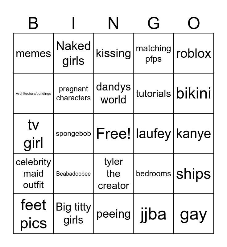 This bingo card has a free space and 24 words: Beabadoobee, Big titty girls, dandys world, feet pics, roblox, memes, Architecture/buildings, Naked girls, laufey, tyler the creator, tutorials, tv girl, bedrooms, ships, pregnant characters, jjba, kanye, kissing, bikini, spongebob, gay, celebrity maid outfit, matching pfps and peeing.