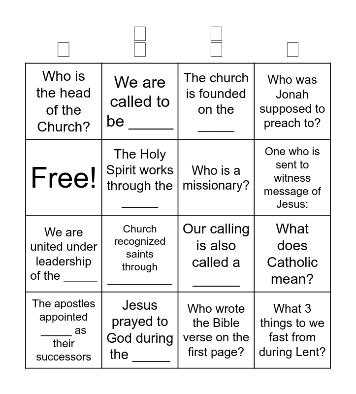This bingo card has 16 words: Jesus prayed to God during the _____, What does Catholic mean?, The church is founded on the _____, Who is the head of the Church?, We are united under leadership of the _____, We are called to be _____, Our calling is also called a ______, Who wrote the Bible verse on the first page?, Free!, The Holy Spirit works through the _____, The apostles appointed _____ as their successors, Who was Jonah supposed to preach to?, Church recognized saints through ___________, One who is sent to witness message of Jesus:, Who is a missionary? and What 3 things to we fast from during Lent?.