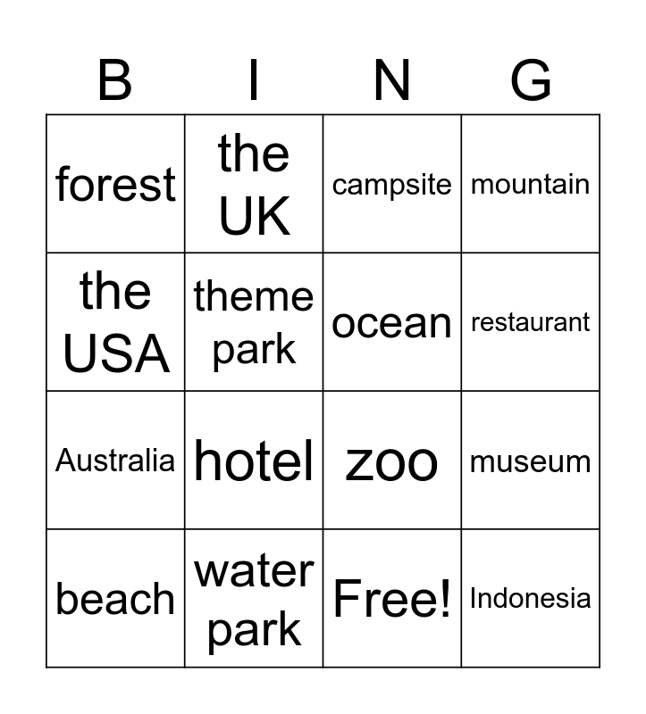 This bingo card has 17 words: Free!, beach, campsite, forest, hotel, mountain, museum, ocean, restaurant, theme park, water park, zoo, the USA, the UK, Australia, China and Indonesia.