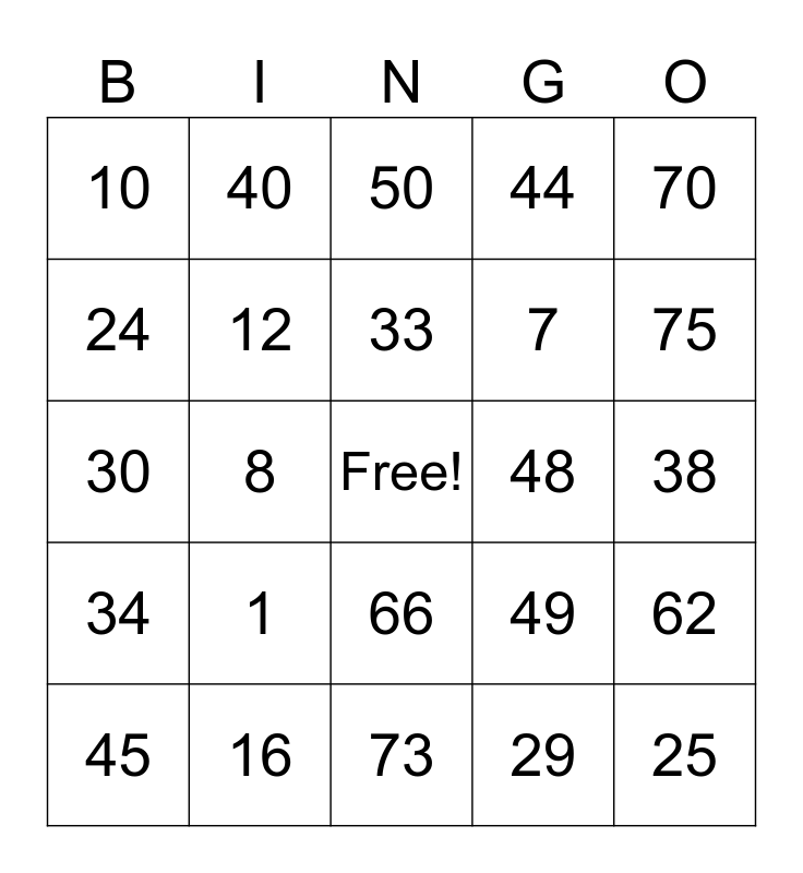 This bingo card has a free space and 24 words: 1, 16, 33, 45, 70, 10, 24, 40, 48, 66, 7, 30, 49, 62, 12, 29, 38, 50, 75, 8, 25, 34, 44 and 73.