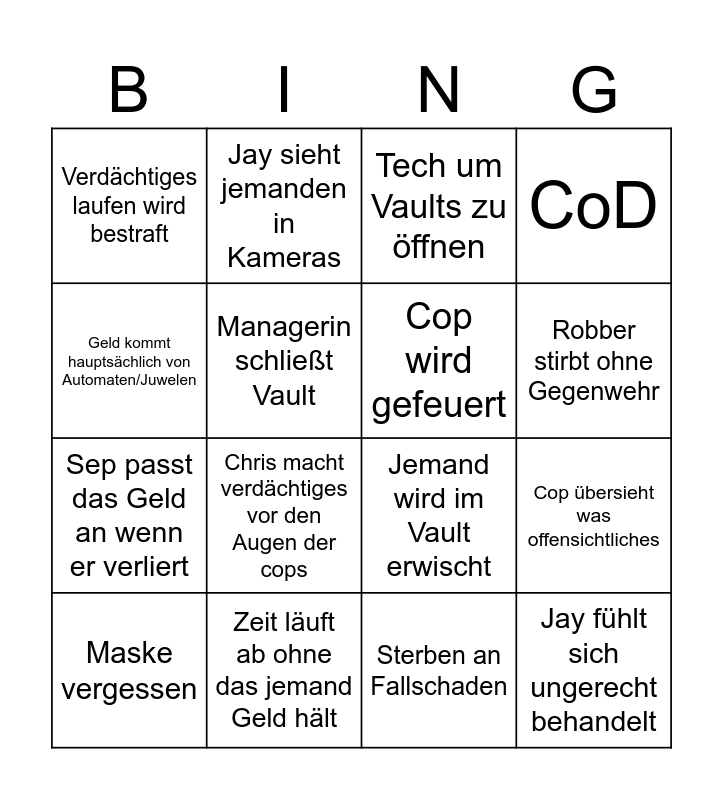 This bingo card has 18 words: Chris macht verdächtiges vor den Augen der cops, Jay fühlt sich ungerecht behandelt, Tech um Vaults zu öffnen, Verdächtiges laufen wird bestraft, Jemand wird im Vault erwischt, CoD, Maske vergessen, Jay sieht jemanden in Kameras, Robber stirbt ohne Gegenwehr, Sep passt das Geld an wenn er verliert, Sterben an Fallschaden, Geld kommt hauptsächlich von Automaten/Juwelen, Cop übersieht was offensichtliches, Managerin schließt Vault, Cop wird gefeuert, Drohne gibt Geld ab, Zeit läuft ab ohne das jemand Geld hält and CPU killt jemanden.