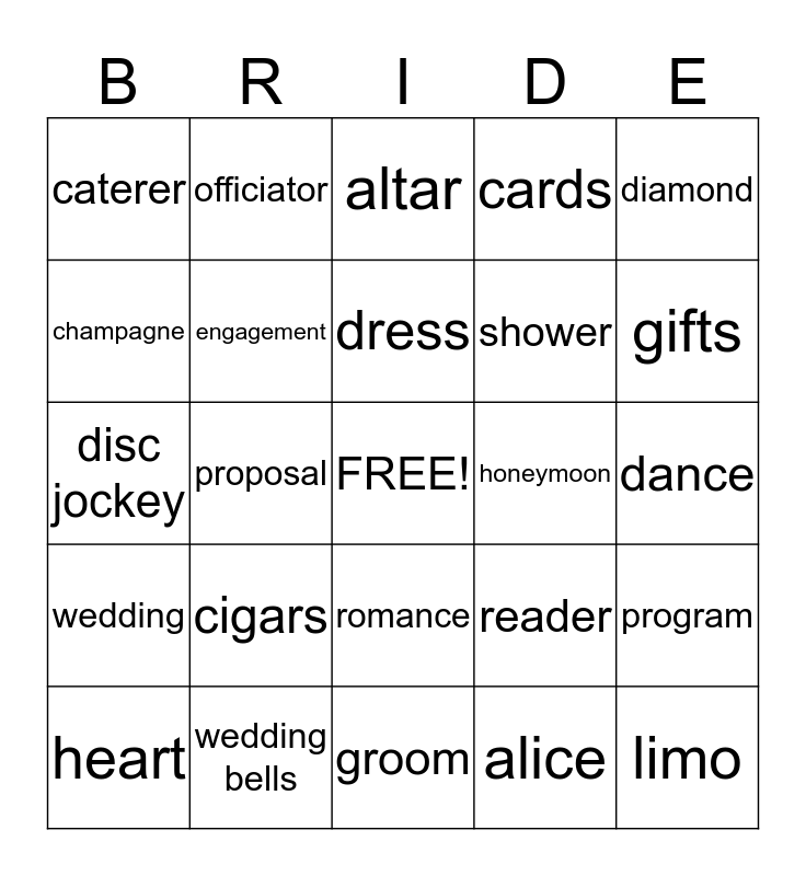 This bingo card has a free space and 80 words: accessory, aisle, altar, announcement, attendant, attire, best man, bouquet, bride, bridesmaid, cake, camera, cards, caterer, ceremony, champagne, cherish, cigars, couple, dance, decorations, diamond, disc jockey, dress, engagement, flower basket, flower girl, flowers, formal wear, garter, gifts, gown, groom, guests, heart, honeymoon, husband, invitation, jewelry, limo, love, love birds, maid of honour, marriage, nuptial, officiator, party favors, photographer, planner, present, program, proposal, reader, reception, rehearsal, rice?, ring, ring bearer, ring pillow, romance, shower, songs, theme, tiara, toasting flutes, tuxedo, unity candle?, usher, veil, vows, wedding, wedding bells, wife, wine, diana, rowan, alice, mai, tuany and doreen.