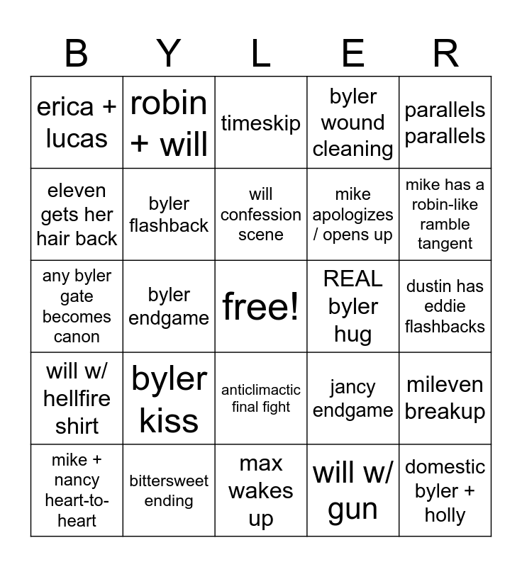 This bingo card has a free space and 24 words: byler kiss, bittersweet ending, will confession scene, mike + nancy heart-to-heart, parallels parallels, erica + lucas, eleven gets her hair back, robin + will, REAL byler hug, anticlimactic final fight, mike apologizes / opens up, any byler gate becomes canon, jancy endgame, mileven breakup, byler flashback, will w/ gun, dustin has eddie flashbacks, timeskip, mike has a robin-like ramble tangent, byler endgame, domestic byler + holly, will w/ hellfire shirt, byler wound cleaning and max wakes up.