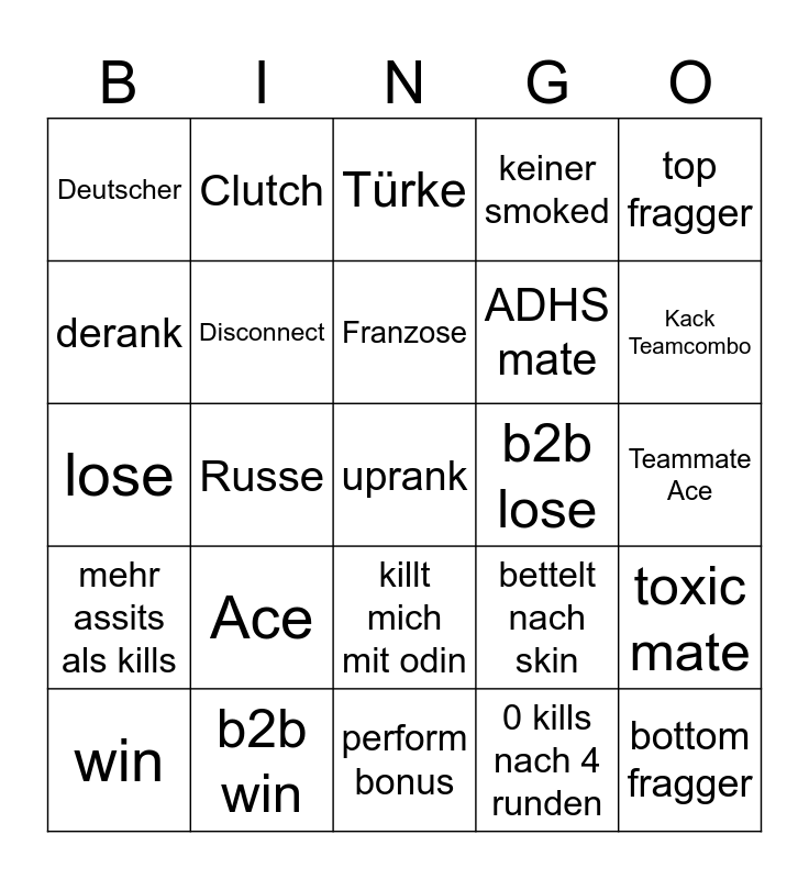 This bingo card has a free space and 24 words: Ace, b2b win, Franzose, win, top fragger, Deutscher, derank, Clutch, b2b lose, killt mich mit odin, ADHS mate, lose, bettelt nach skin, toxic mate, Disconnect, 0 kills nach 4 runden, Teammate Ace, Türke, Kack Teamcombo, Russe, bottom fragger, mehr assits als kills, keiner smoked and perform bonus.