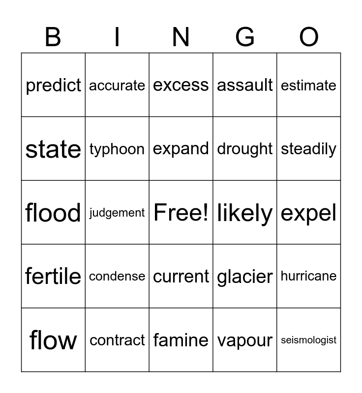 This bingo card has a free space and 24 words: condense, contract, expand, flow, estimate, predict, state, accurate, likely, current, drought, flood, glacier, hurricane, typhoon, vapour, expel, excess, steadily, judgement, seismologist, fertile, assault and famine.