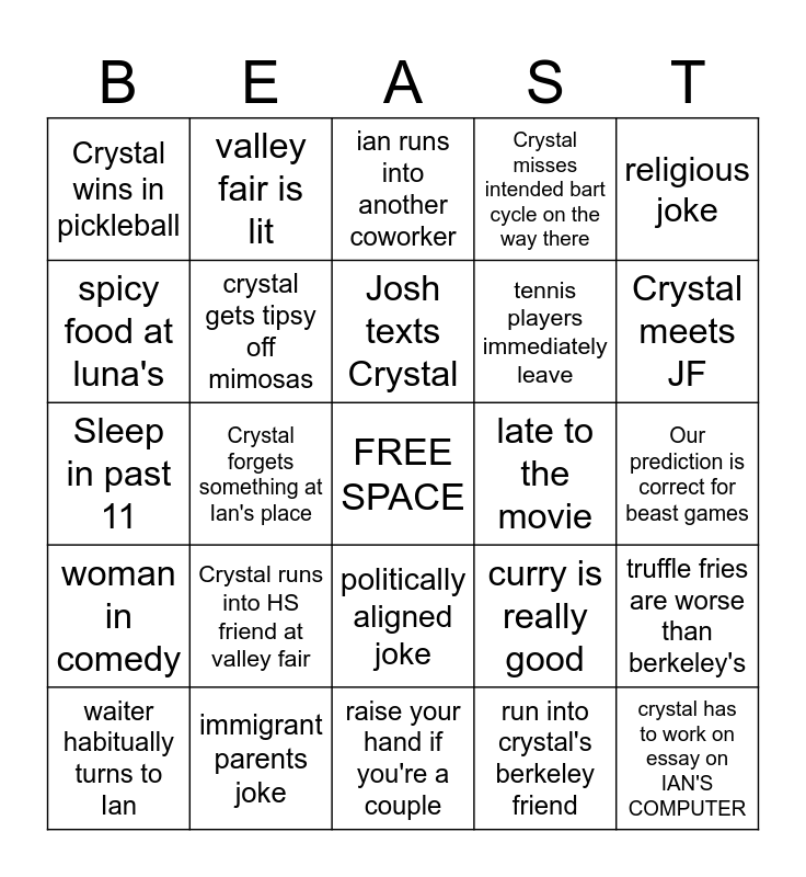 This bingo card has 25 words: woman in comedy, immigrant parents joke, FREE SPACE, run into crystal's berkeley friend, religious joke, Crystal wins in pickleball, valley fair is lit, ian runs into another coworker, late to the movie, truffle fries are worse than berkeley's, spicy food at luna's, crystal gets tipsy off mimosas, raise your hand if you're a couple, curry is really good, Crystal meets JF, waiter habitually turns to Ian, Crystal forgets something at Ian's place, Josh texts Crystal, tennis players immediately leave, Our prediction is correct for beast games, Sleep in past 11, Crystal runs into HS friend at valley fair, politically aligned joke, Crystal misses intended bart cycle on the way there and crystal has to work on essay on IAN'S COMPUTER.
