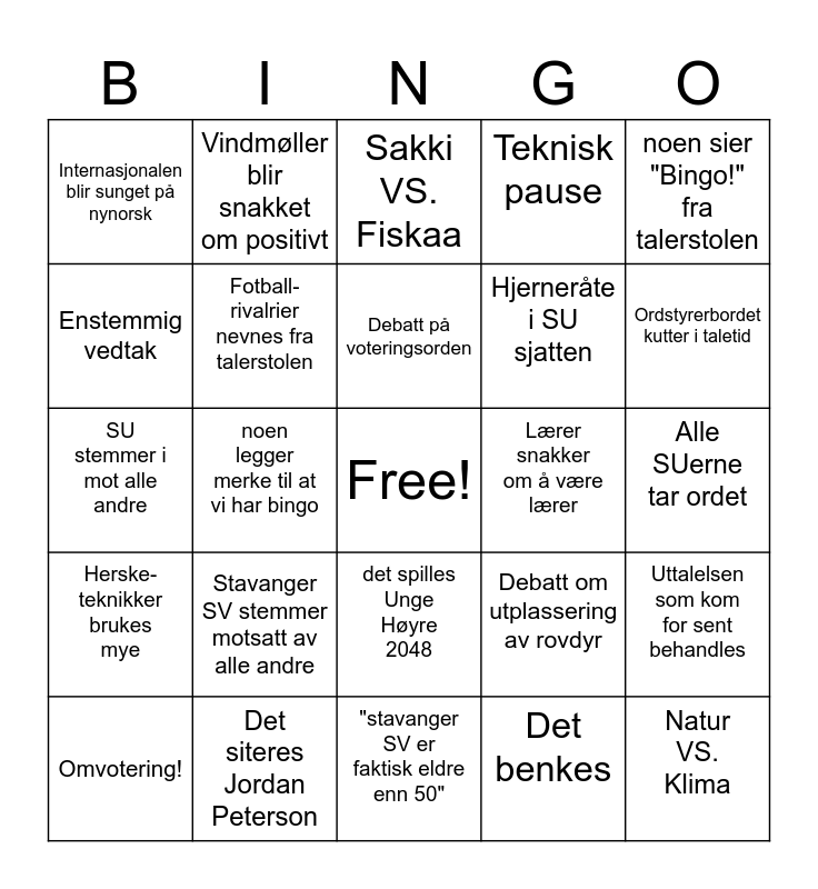 This bingo card has a free space and 24 words: Stavanger SV stemmer motsatt av alle andre, Det siteres Jordan Peterson, Debatt på voteringsorden, Omvotering!, noen sier "Bingo!" fra talerstolen, Internasjonalen blir sunget på nynorsk, Enstemmig vedtak, Vindmøller blir snakket om positivt, Lærer snakker om å være lærer, det spilles Unge Høyre 2048, Hjerneråte i SU sjatten, SU stemmer i mot alle andre, Debatt om utplassering av rovdyr, Uttalelsen som kom for sent behandles, Fotball-rivalrier nevnes fra talerstolen, Det benkes, Alle SUerne tar ordet, Sakki VS. Fiskaa, Ordstyrerbordet kutter i taletid, noen legger merke til at vi har bingo, Natur VS. Klima, Herske-teknikker brukes mye, Teknisk pause and "stavanger SV er faktisk eldre enn 50".