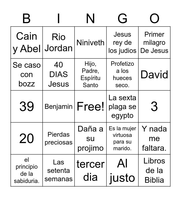This bingo card has a free space and 24 words: el principio de la sabiduria., Pierdas preciosas, Hijo, Padre, Espíritu Santo, Al justo, Primer milagro De Jesus, Cain y Abel, Rio Jordan, Niniveth, La sexta plaga se egypto, 3, 39, 40 DIAS Jesus, Es la mujer virtuosa para su marido., Y nada me faltara., Se caso con bozz, Las setenta semanas, tercer dia, Jesus rey de los judios, David, 20, Benjamin, Daña a su projimo, Profetizo a los hueces seco. and Libros de la Biblia.