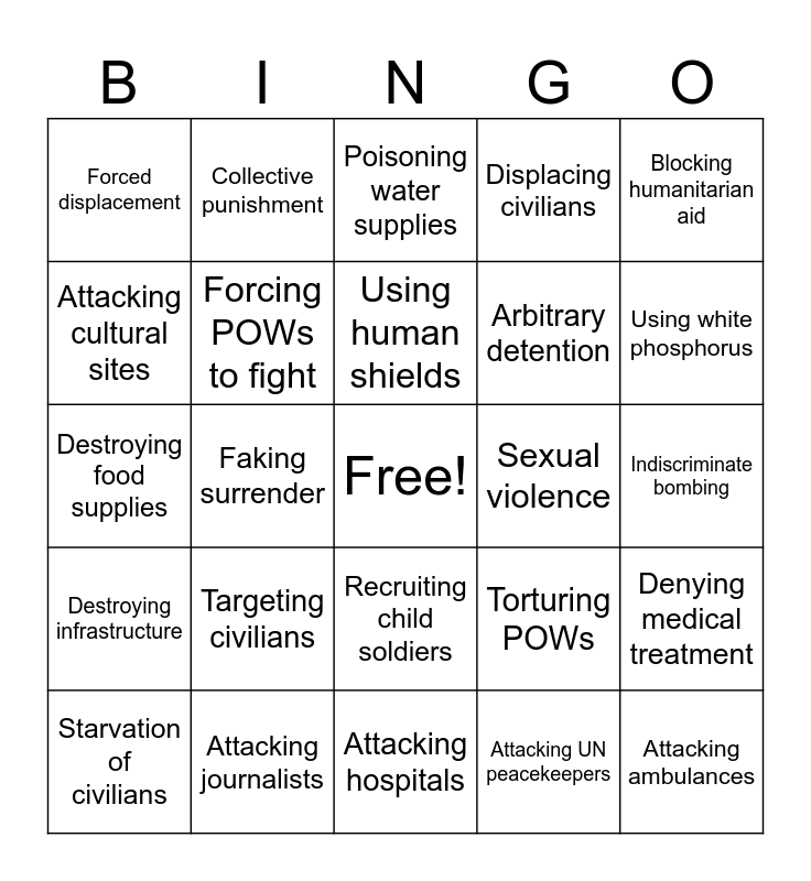 This bingo card has a free space and 25 words: Targeting civilians, Attacking hospitals, Using human shields, Starvation of civilians, Blocking humanitarian aid, Forced displacement, Attacking cultural sites, Collective punishment, Sexual violence, Recruiting child soldiers, Arbitrary detention, Destroying food supplies, Torturing POWs, Denying medical treatment, Forcing POWs to fight, Using chemical weapons, Indiscriminate bombing, Poisoning water supplies, Using white phosphorus, Faking surrender, Attacking ambulances, Attacking journalists, Destroying infrastructure, Displacing civilians and Attacking UN peacekeepers.